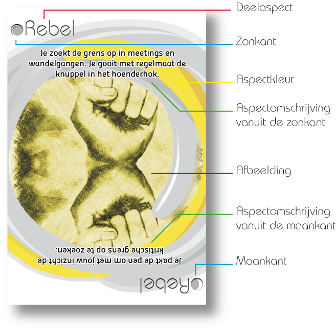 aspecten zoals: archetypen, rollen, succesfactoren, samenwerken en verandering. Elk aspect heeft negen specifieke deelaspecten. Er is gekozen voor een universele taal waarbij telkens de zonkant en de maankant worden belicht.